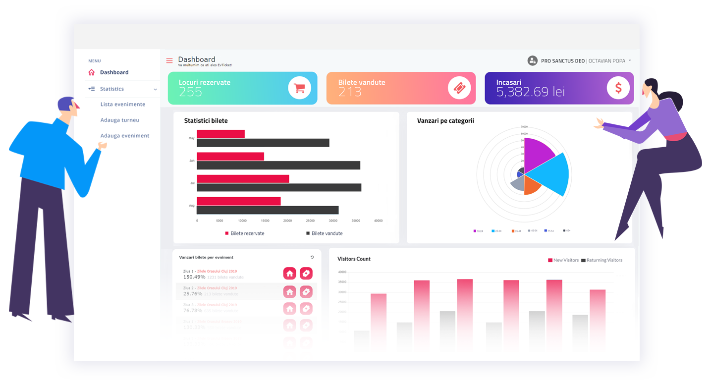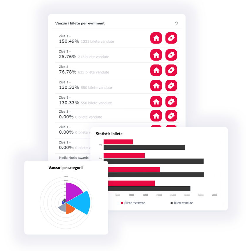 Cu un simplu log-in în contul personal poți gestiona evenimentele și vizualiza statistici pentru fiecare eveniment in parte. Suntem la dispoziția ta 24/24 și intervenim pentru a soluționa orice problemă. În plus, te ghidăm cu un tutorial pentru organizarea evenimentului prin platforma noastră.