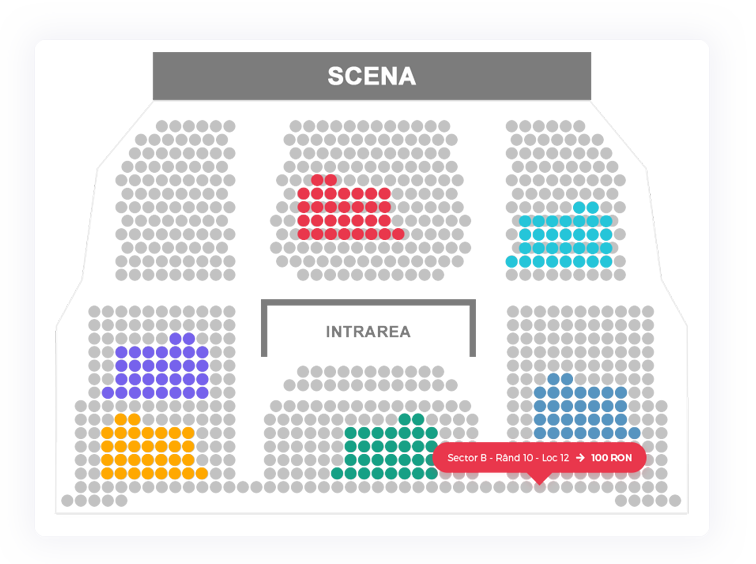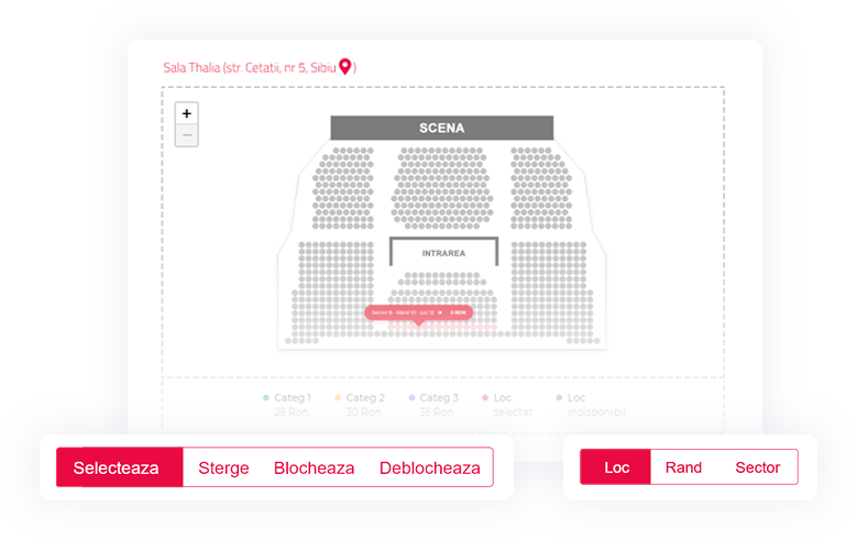 Selectezi locurile și stabilești prețurile biletelor în funcție de așezarea în sală.